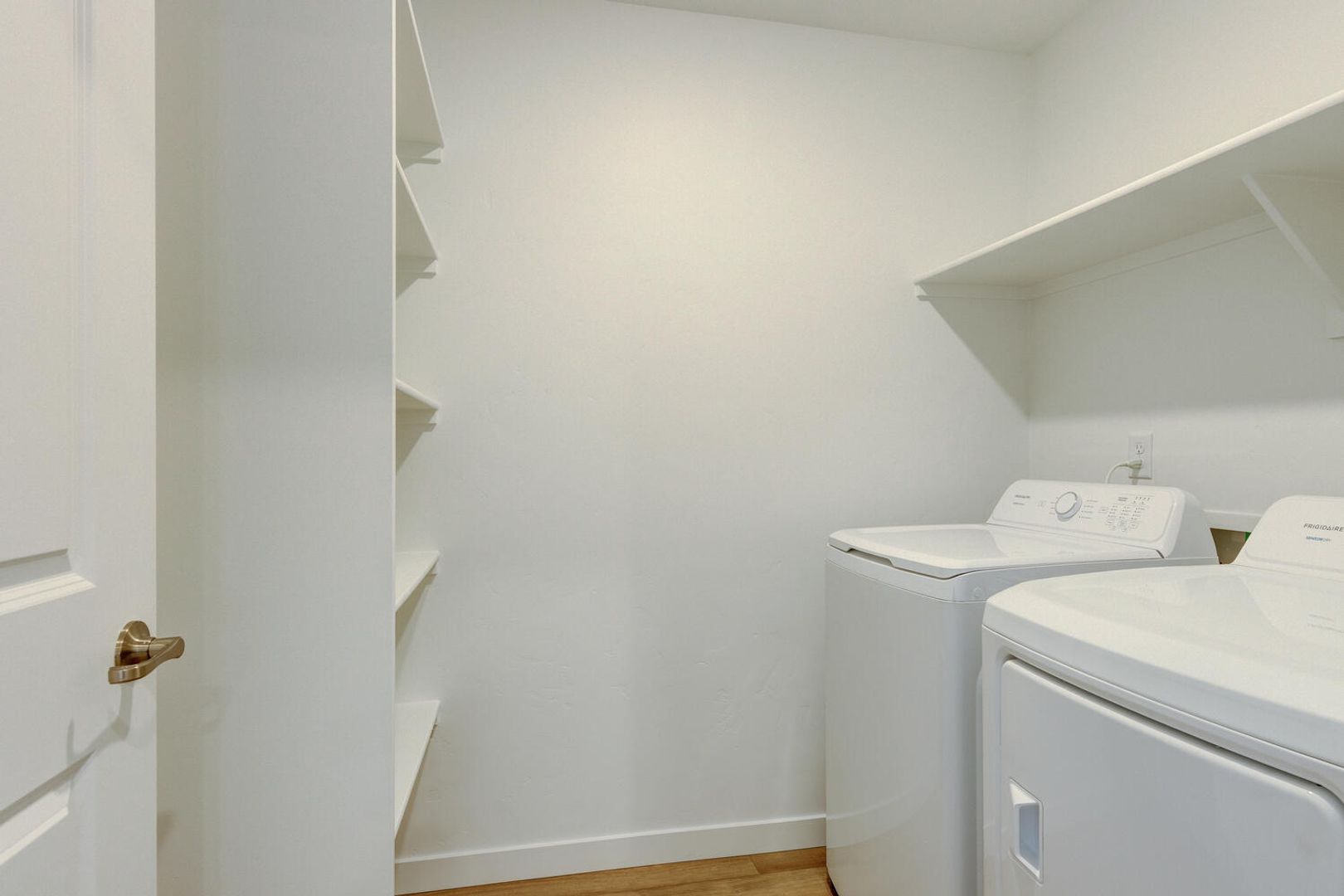 Ultimate Convenience: A full-sized washer and dryer, stainless steel refrigerator, and custom window blinds.